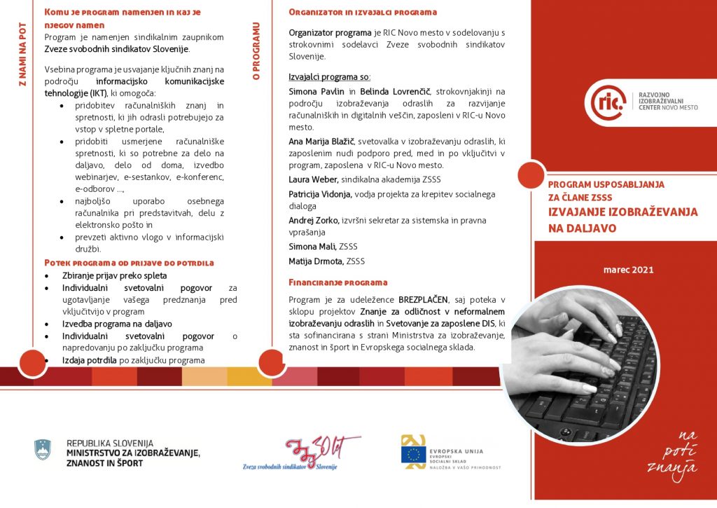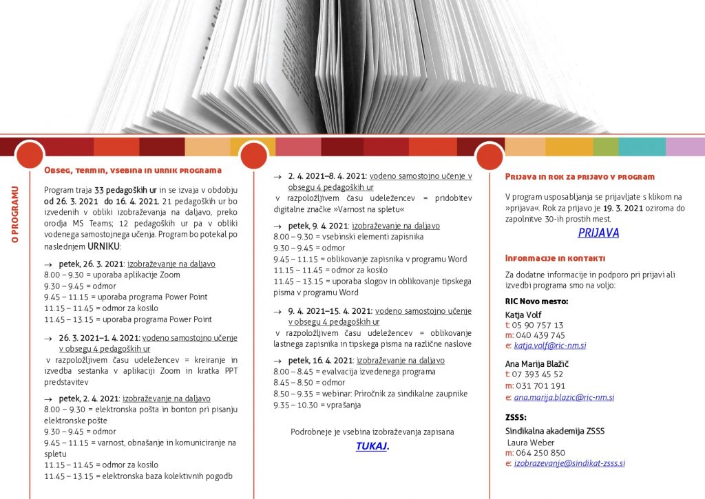 Izobraževanje v okviru projekta Za krepitev socialnega dialoga organizira Regijska mreža Dolenjska. Izobraževanje v obsegu 33 pedagoških ur poteka med 26. marcem in 16. aprilom 2021. 21 pedagoških ur bo izvedenih v obliki izobraževanja na daljavo, prek orodja Microsoft Teams (26. marca, 2., 9. in 16. aprila), 12 pedagoških ur pa v obliki vodenega samostojnega učenja. Usposabljanje je za sindikalne zaupnike brezplačno.